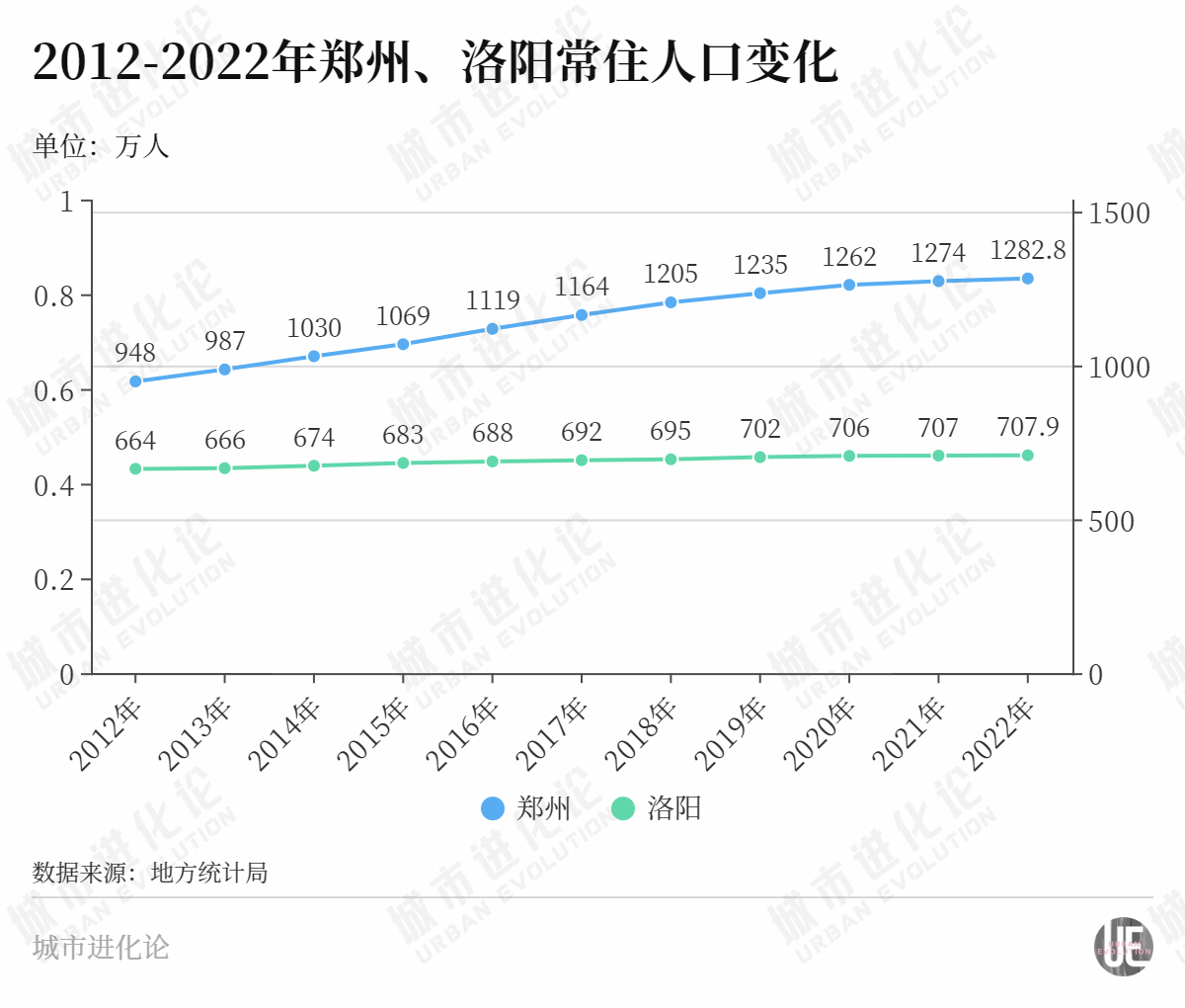 放到省内,在2012~2022年的十年间,郑州常住人口占全省人口比重从9.9%增加到13%,增长超过3个百分点;洛阳则从7%增至7.2%,仅增长0.2个百分点。