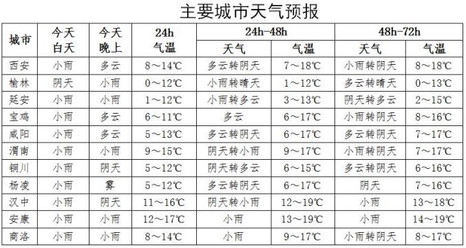 3日:陕北多云间阴天,关中、陕南阴天间多云,关中南部部分、陕南大部有小雨,陕南南部部分地方有中雨。