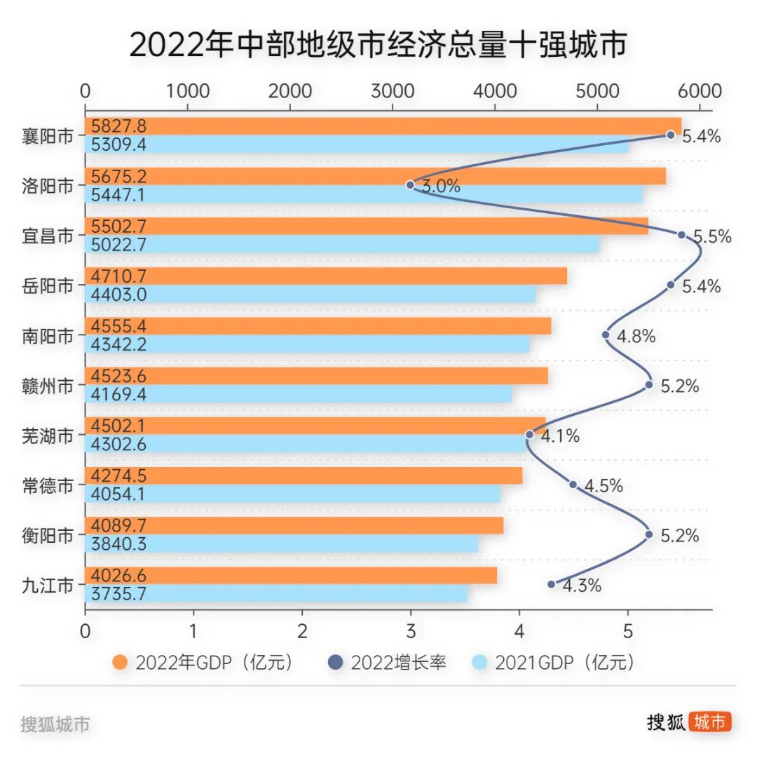 与洛阳一样“失落”的还有安徽芜湖,江城经济总量被江西赣州以21亿元微弱优势反超。洛阳和芜湖可谓“惺惺相惜”:2022年洛阳GDP增速、芜湖GDP增量均垫底中部地级市十强城市,两地排位下落也就顺理成章了。