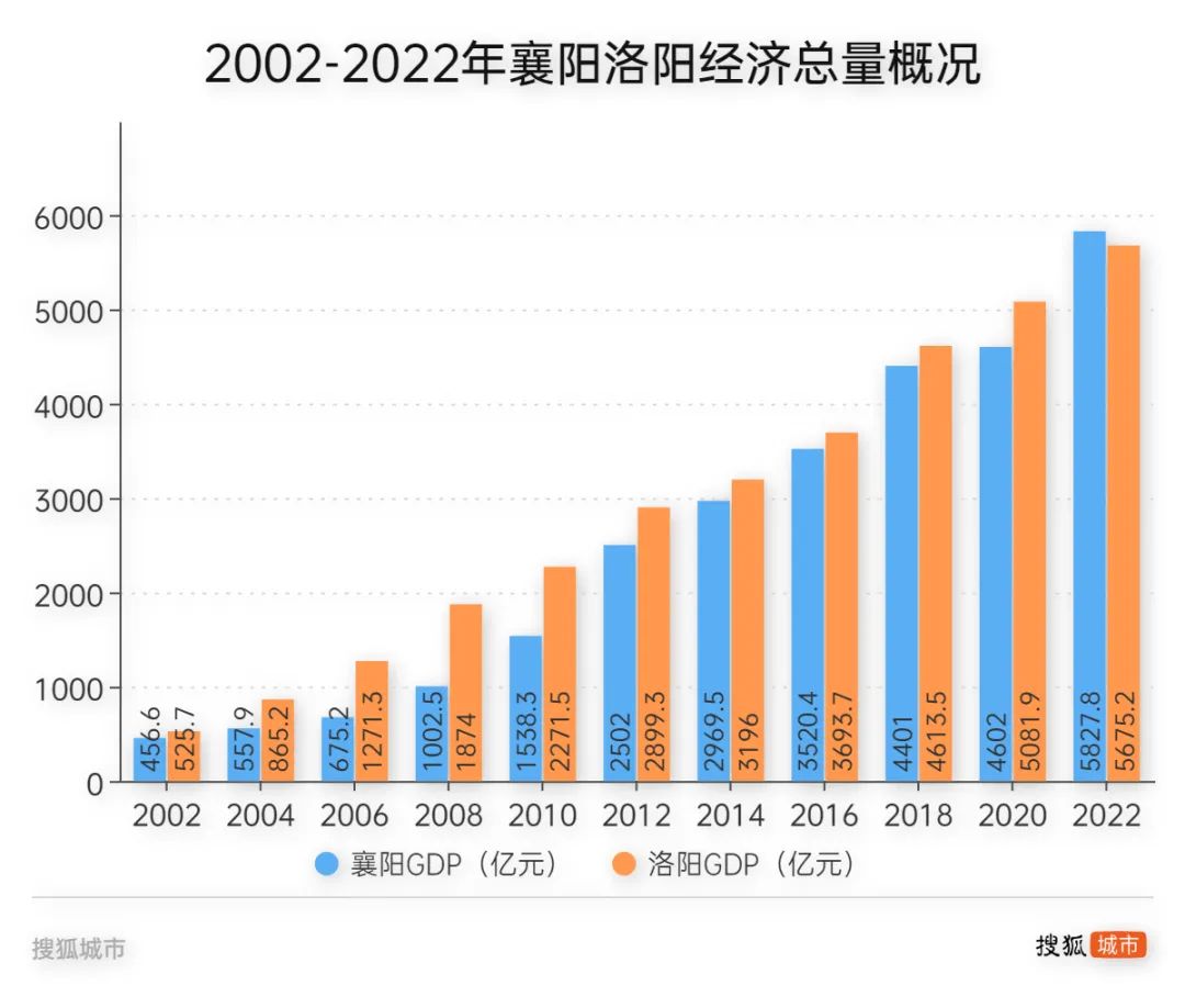 新世纪以来洛阳一直都是中部地级市“翘楚”,去年排位滑落是“量变引起质变“。2009年、2019年洛阳GDP分别突破2000亿、5000亿元大关,每个千亿节点都领先襄阳。不过,近年洛阳增速趋缓,襄阳趁势反超。2020年至2022年,洛阳经济增速分别为3%、4.8%、3%,而襄阳2020-2021年年均增长4.1%,2022年增速5.4%。