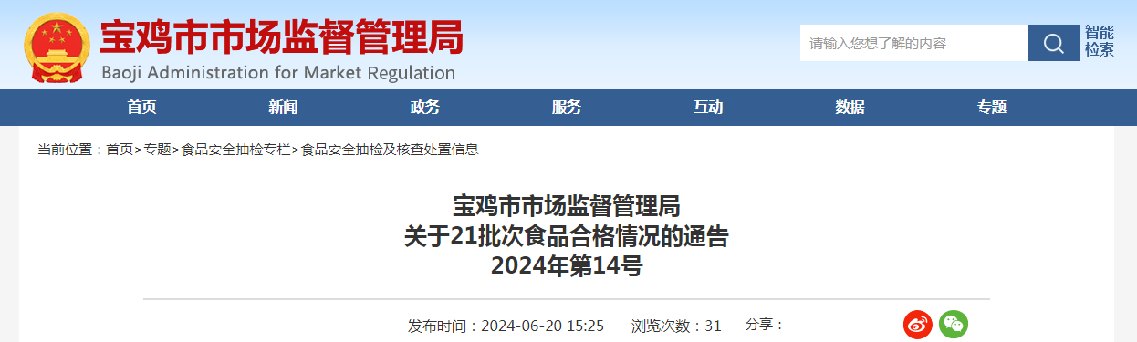陕西省宝鸡市市场监督管理局关于21批次食品合格情况的通告(2024年第14号)