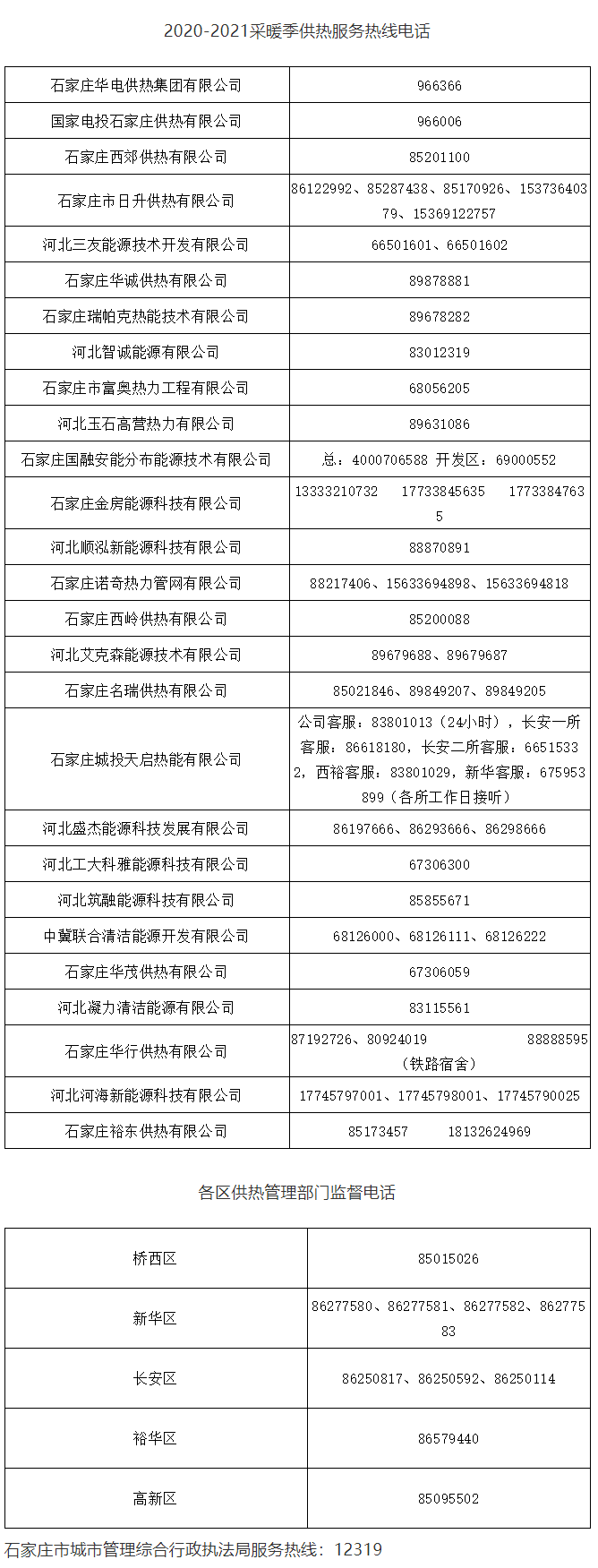 为进一步提升供热服务质量,各供热企业已设立24小时服务热线,邢台市热力公司服务电话:5995119;邢台旭阳安能热力有限公司服务电话:3217111;邢台金昊热力开发有限公司服务电话:2632345。