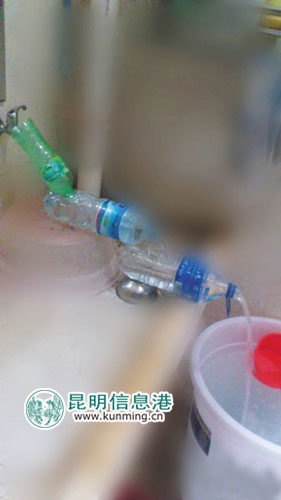 “宿舍会不时停水,学校给每个宿舍都配备了一个大桶用来蓄水。”据昆明理工大学宋同学透露,该校为每个宿舍都准备了一个大桶,但这么大的桶并未配备塑料管,往桶里装水真不方便,蓄水也成了大难题。于是舍友们想出了一个蓄水的办法:利用“罗平的水车”原理,改装塑料水瓶,将其输送环节连接起来,将自来水导入水桶内。