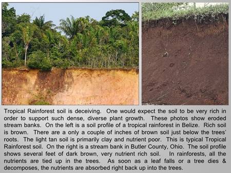 热带地区的土壤:枯枝落叶以及其他这类落地的有机物在微生物和小动物的作用下会迅速分解