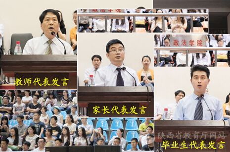 哲学系教师何振鹏代表全体教师对毕业生完成学业表示衷心祝贺,期望毕业生在步入社会之际要心怀为天地立心、为生民立命、为往圣继绝学、为万世开太平的信念,坚持不懈地为梦想和目标去奋斗。毕业生家长代表吴晓英向四年来为孩子们付出辛勤劳动的学院领导、老师表示最衷心的感谢和最崇高的敬意,向圆满结束四年大学生活,即将奔赴新的工作、学习岗位的各位毕业生表示由衷的祝贺,并表示他们将一如既往地关注学院的发展变化,做学院事业的热情宣传者,做学院成就的真诚喝彩者,并祝福学院越办越好。2015届毕业生代表佘旭东代表全体毕业生对向辛勤培育他们的母校和老师,表示最衷心的感谢和最崇高的敬意,同时,祝愿全体毕业生梦想成真,事业有成,前程似锦,祝愿母校蓬勃发展,再谱华章,再创辉煌。
