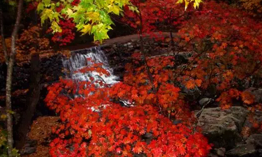 关门山是以枫叶著称的,枫叶多得让你数不过来,美得让你感觉像是走进了仙境,红得是一团大火焰。这里的枫叶一片缀连着一片,一株缀连着一株,像火焰,像扇子,形态万千,千姿百态。“每当秋季来临,枫叶飘飘,鲜红、粉红、猩红、桃红,层次分明。“瑟瑟秋风中,似红霞排山倒海而来,整座山似乎都摇晃起来了,又有松柏点缀其间,红绿相间,瑰奇绚丽。