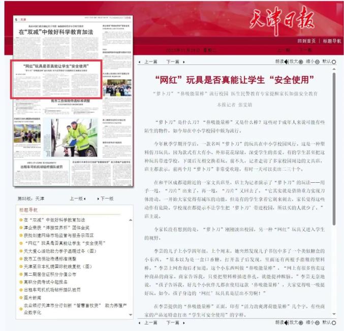 原标题:《《天津日报》:公安红桥分局民警提醒家长警惕“网红”玩具 加强安全教育 共筑学生安全防护网》