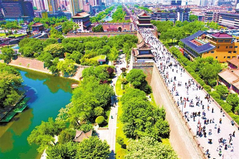 “五一”假期,来陕西的游客增多。西安城墙景区每日最大承载量为7万人,景区采取临时限流疏导措施确保游客安全。图为4月30日,游客在西安城墙景区游览。 记者 杜玮摄