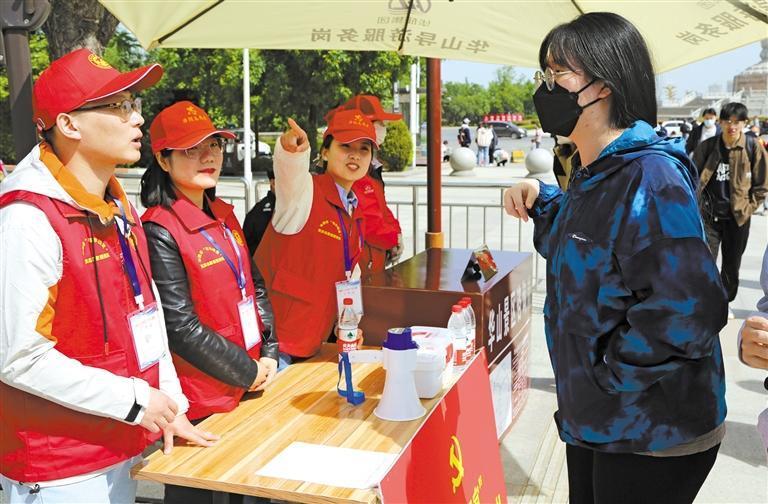 4月29日,华阴市367名“与华相宜”党员志愿者在华山北站、连霍高速华阴出口、华山游客中心等地,热情地为游客提供交通、住宿、就餐等引导服务,为景区增添了一道红色风景线。 通讯员 赵婧华摄