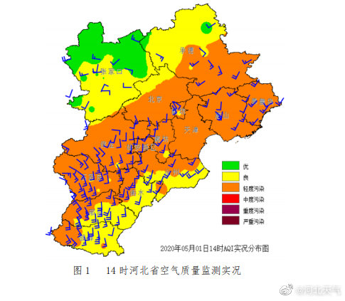 据@河北天气,我省地面受低压影响,以偏南风为主,风力 2-4 级,相对湿度30%-40%,中南部地区气温 31-35℃,气象条件有利于 O3生成。14 时空气质量监测显示,全省空气质量以轻度污染为主,其中邯郸、张家口空气质量为良,首要污染物主要为 O3。