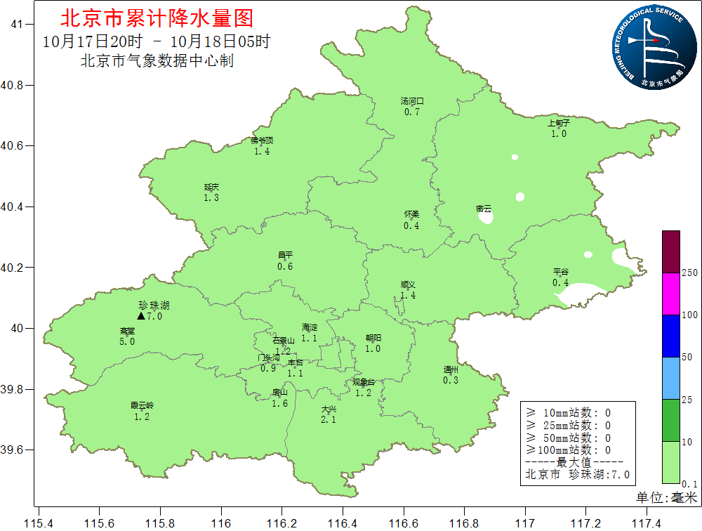 市气象台发布17日20时至18日05时降水量(毫米):全市平均1.3,城区平均(朝,海,丰,石,东,西)1.2,西南(门,房)2.6,西北(延,昌)1.2,东南(通,大)1.1,东北(密,顺,平,怀)0.6;城区最大海淀西二旗2.4,全市最大门头沟珍珠湖7,最大小时降水强度门头沟珍珠湖2.5毫米/小时(17日21时-22时)。