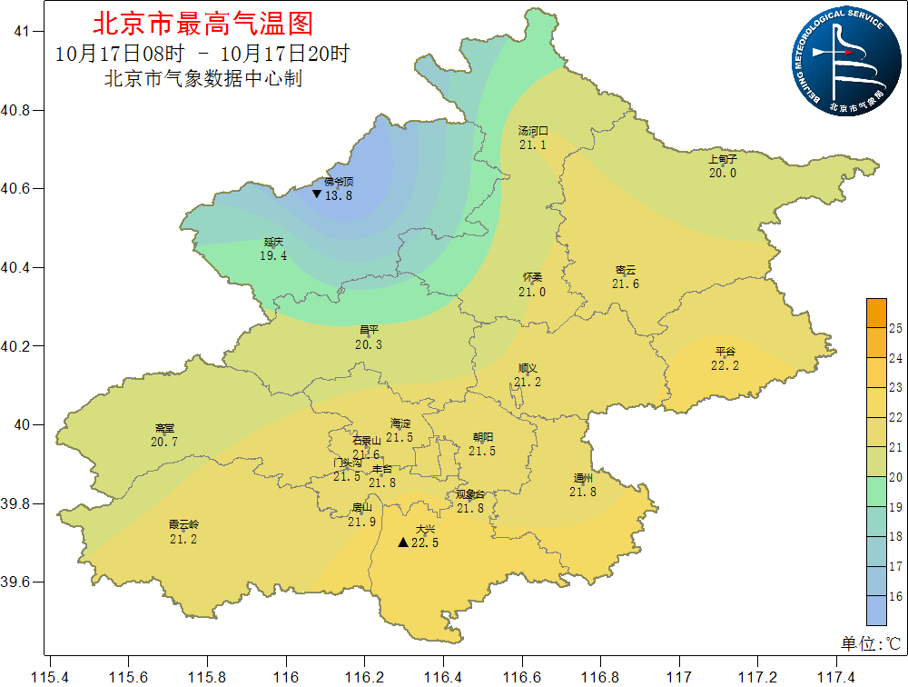 17日08时至17日20时,南郊观象台最高气温为21.8℃(17日14:10)。