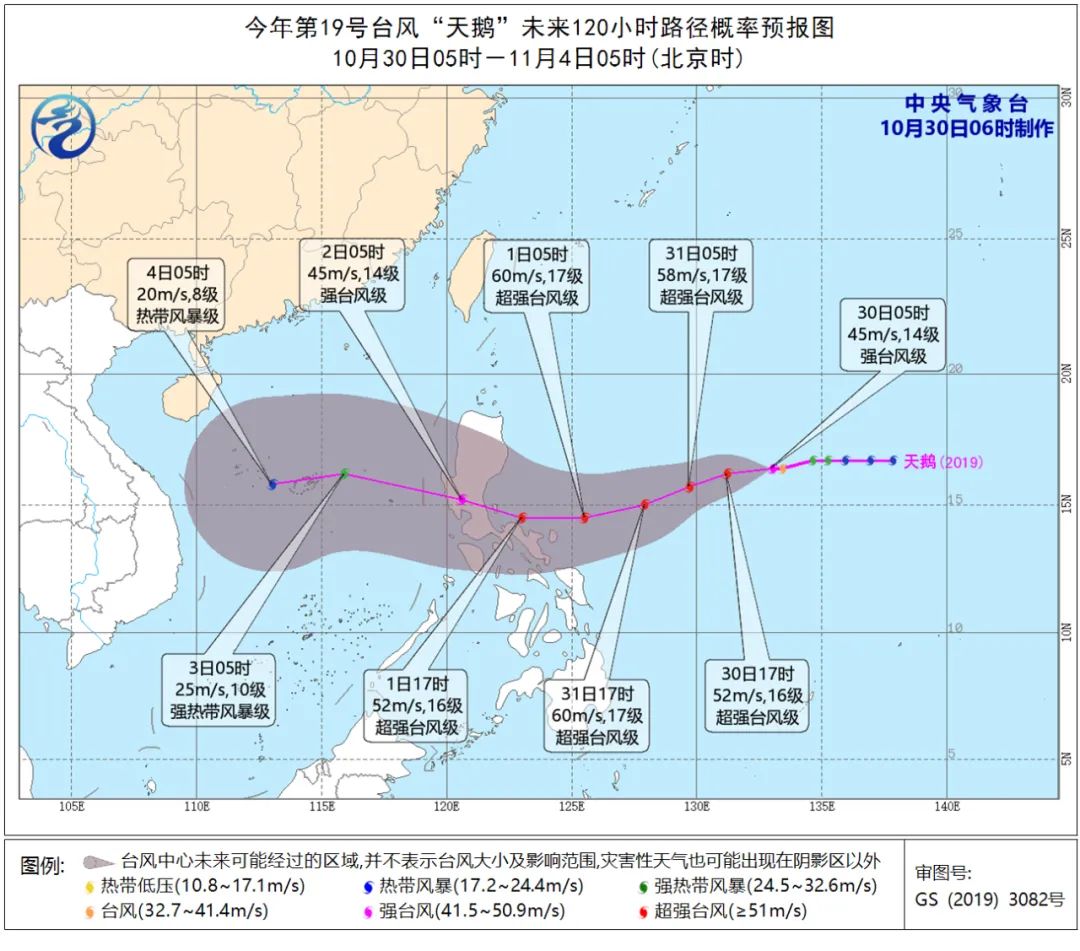 与此同时,今年第19号台风“天鹅”已于今天早晨5点钟加强为强台风级,其中心早晨5点钟位于菲律宾马尼拉偏东方约1300公里,就是北纬16.4度,东经133.0度,中心附近最大风力有14级(45米/秒)。