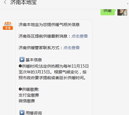 温馨提示:微信搜索公众号济南本地宝,关注后在对话框回复【供暖】可获济南供暖时间,咨询电话,缴费入口和方法,缴费标准,退费和报停方法等。