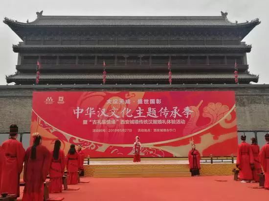 除了汉城湖景区,在西安城墙景区举行的汉式婚礼更具特色。20对新人着汉服、行周礼,一场穿越千年爱恋的传统汉式婚礼仪式就此开启。