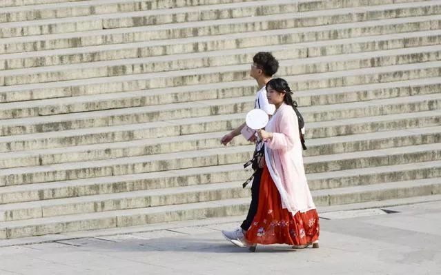钟鼓楼广场上,穿汉服的男孩女孩和同伴逛街。