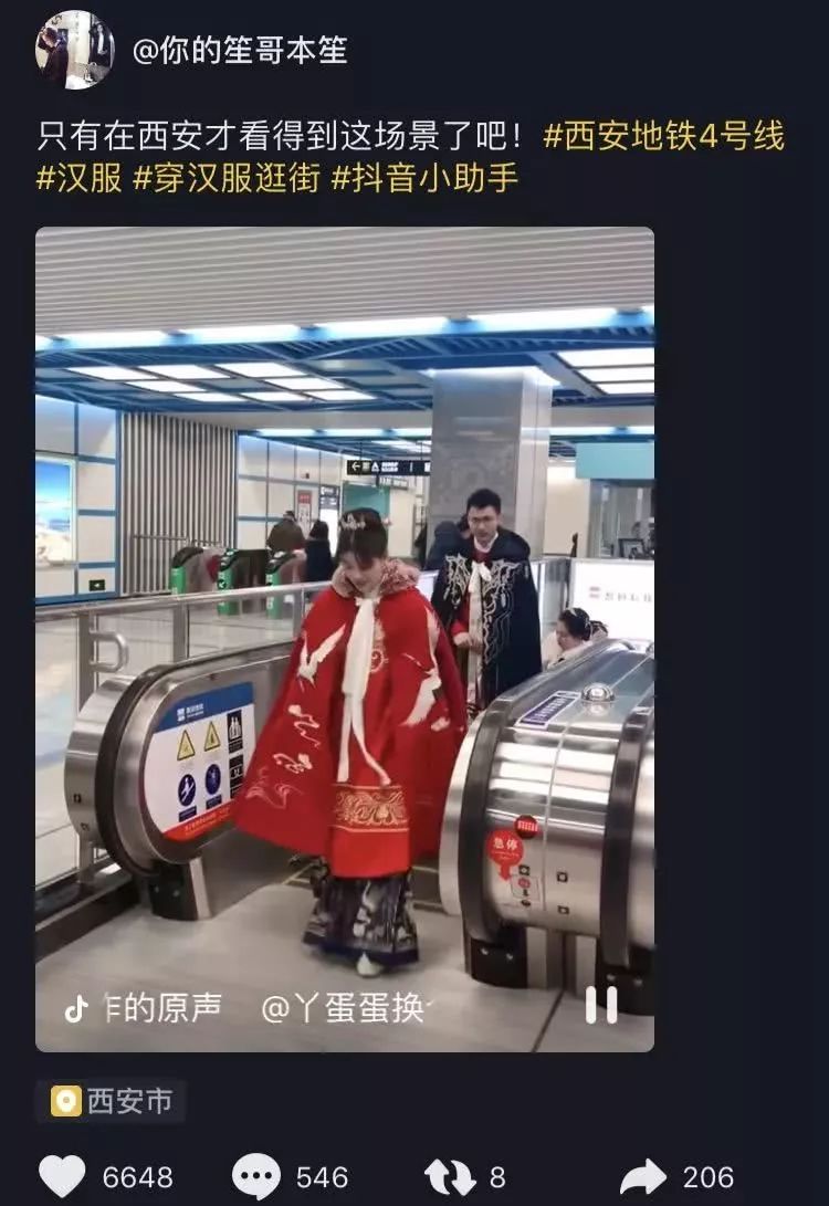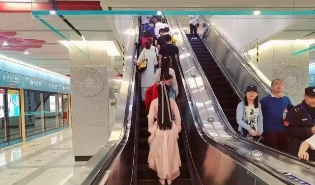 汉服女子行走在地铁站内,古典与现代在西安的融合,竟然十分完美和谐。