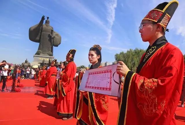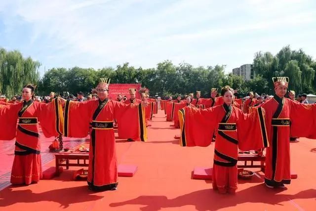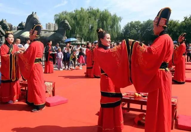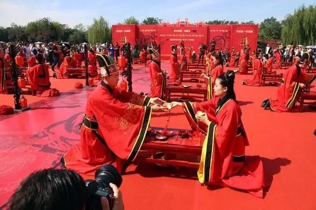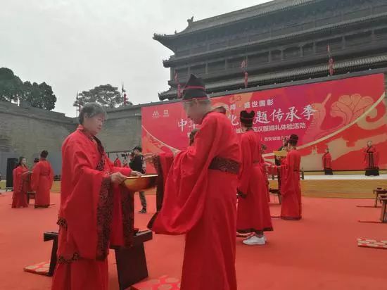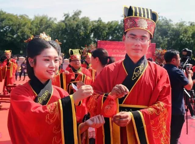 这些新人通过汉式集体婚礼的演示体验,见证爱情的海誓山盟,传承千年的礼乐。