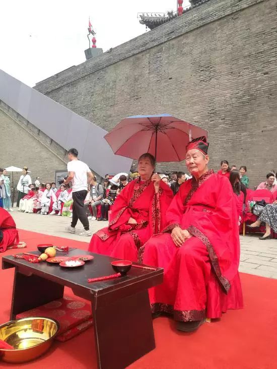 汉式婚礼现场,一对朝夕相伴50年的耄耋夫妻成了现场亮点。张先生说:“感谢西安城墙举办的汉式婚礼,给了我们一个非常美好的回忆”。