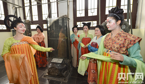 酒晕妆、桃花妆、飞霞妆、胡妆、北苑妆、梅花妆,圆领袍、半臂、衫裙、帔、缺胯袍、大口裤,华丽的妆容、自信的气场……十几位着唐服的模特在古乐的伴奏下演绎亮相,仿佛“复活”的莫高窟壁画一般,从一千多年前的大唐长安穿越而来,吸引了游客和市民纷纷合影拍照。