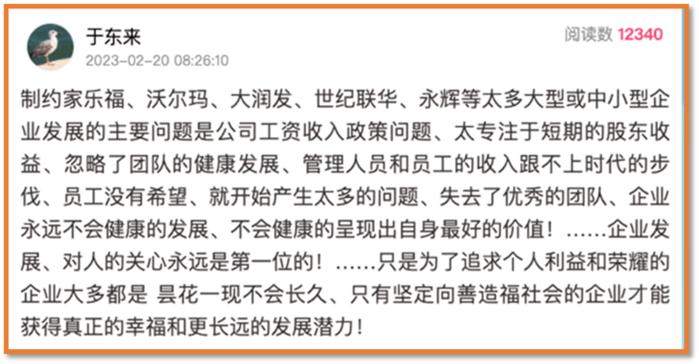 如前述,胖东来员工的工资在许昌当地是有竞争力的,创始人于东来也不把自己的财富藏着掖着独享,而是会回馈给员工,有分析人士称胖东来的管理是满满的“利他思维”。看上去老板挺吃亏,但因为发挥了员工的积极性和主动性,实际上这位精明的老板,是在看不见的地方,把员工的“内耗成本”降到最低,而把员工的“创造性”发挥到最高。