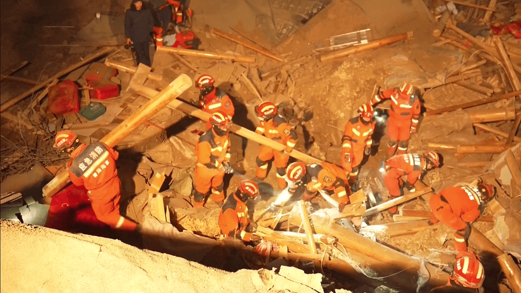 2023年12月18日,甘肃临夏州积石山县发生6.2级地震,消防人员赶赴现场开展救援。(视频截图) 图源:视觉中国