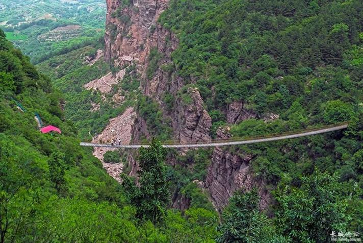 独特的丹霞地貌形成的鲜红欲滴的红色岩石,给奇峰怪石上色,与绿林莽山相和,给人带来极致的视觉享受,如此美景,让人身处其中时忘却一切烦恼,吐纳之间都带着一股山间的清幽。修建在海拔千米上的绝壁栈道,堪称太行山人工奇观。漫步栈道,行云缭绕,犹如踏云仙境。登临东太行,“天脊揽胜,云端漫步”,让人豁然开朗。