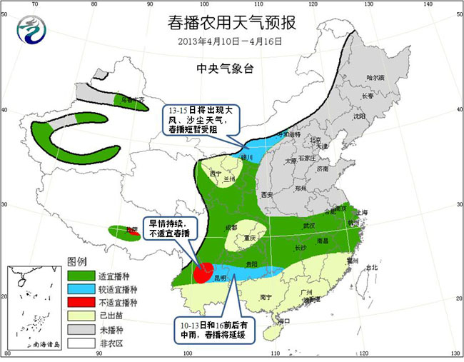 未来一周(4月10-16日),全国春播区大部天气条件较好,适宜春播。10-12日和16日前后,云南东北部将出现小到中雨过程,旱情有望得到缓和,春播条件得到改善;但云南中北部降水仍较稀少,旱情将持续,不利春播。13-15日内蒙古中西部及宁夏和陕西北部等地将出现扬沙或沙尘暴、15-16日贵州南部有中雨,春播将短暂受阻。