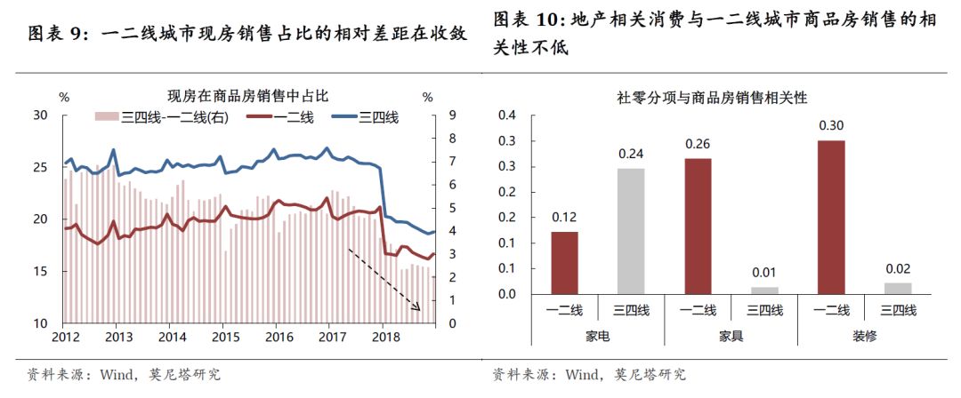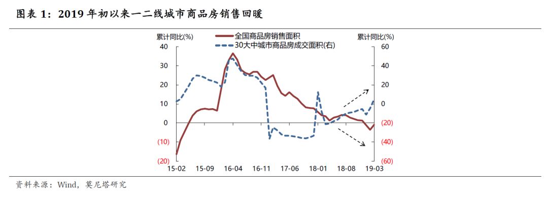 我们认为,尽管一二线城市商品房销售在全国的占比只有三分之一左右,但对于房地产投资、服务和消费的贡献远高于这个比例。因此,当全国商品房销售结构从三四线城市占优转向一二线城市占优,中国经济会获得更大支撑。这可能是2019年1季度,全国商品房销售未明显好转,但房地产投资与消费表现亮眼、整体经济韧性也有增强的原因之一。