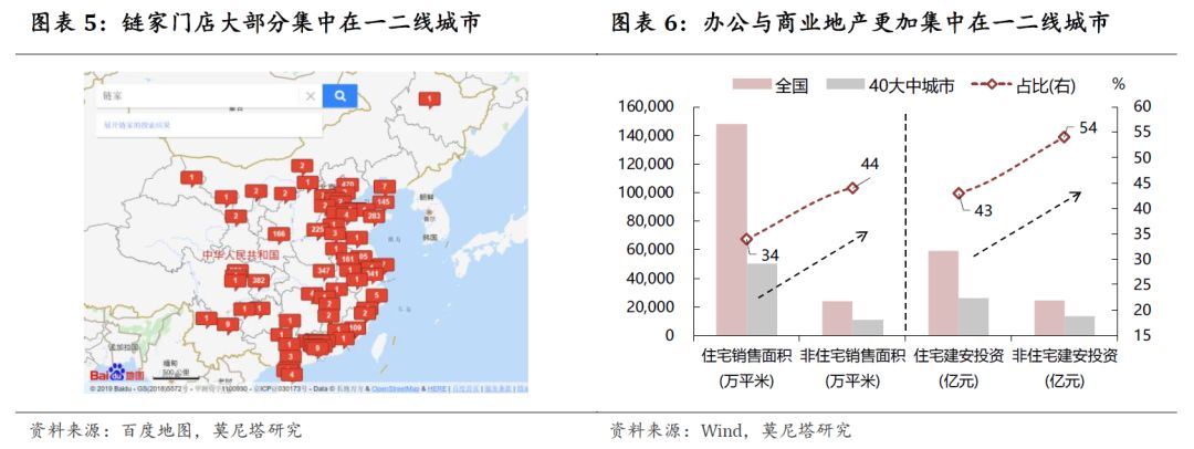 其次,办公与商业地产在一二线城市的规模相对更大。由于人口和商业的集聚,一二线城市对于办公、商业等地产的需求更高,对于租赁、运营、管理等需求的催生作用也就更大。国家统计局数据显示,40大中城市非住宅类商品房销售面积(主要为办公与商业运营)占比全国达到44%,超过住宅商品房占比全国近10个百分点;而非住宅类的建安投资占比全国更是达到54%,超过住宅类建安投资占比全国超过10个百分点(图表6)。近期密集发布的区域政策同样有利于一二线核心城市商业地产的发展。2019年1月,国家发改委在《关于培育发展现代化都市圈的指导意见》中表示,要形成若干现代化都市圈;2019年3月,两会政府工作报告强调城市群的发展;2019年4月,国家发改委发布《2019年新型城镇化建设重点任务》,指出推进城市群与都市圈发展。