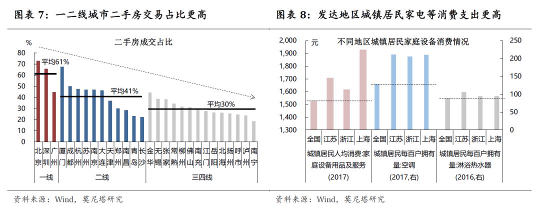 由于二手房成交占比更高、居民消费能力更强,一二线城市对于地产下游消费的拉动更强、更快之前所讨论的一二线城市地产回暖,指的是新房销售,但一二线城市的二手房市场同样会在新房复苏过程中受益。截至2016年底,一线城市二手房成交量在其全部成交中占比超过60%,二线城市平均在41%左右,三线城市为30%(图表7)。一二线城市不仅二手房市场规模较大,且在房屋成交中占比高于三四线城市。这意味着,一二线城市整体房屋成交规模(新房+二手房)在全国占比将高于新房的占比。此外,从居民支出角度看,江浙沪等发达地区的城镇居民对家庭设备用品的消费、以及空调淋浴热水器等中高端家电的拥有量,也高于全国平均水平(图表8)。