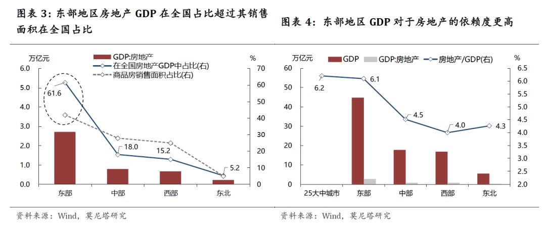 房地产相关的规划、出售、租赁、物管、运营等服务行业产值在一二线城市更为集中。在GDP统计中,房地产相关的建安投资增加值主要体现在第二产业的建筑业中,而房地产作为第三产业,其产值主要来自于相关的规划、出售、租赁、运营管理等服务环节。统计局2017年数据显示,东部地区房地产行业的GDP规模显着超过其他区域,在全国房地产GDP中的占比接近62%,而其商品房销售面积在全商品房销售面积中的占比仅为42%(图表3)。此外,东部地区房地产行业GDP在东部地区经济中的占比达到6.1%,25个大中城市占比也达到6.2%,高于中部、西部、东北地区4%左右的平均水平(图表4)。由于一二线城市更多集中在东部发达地区,这指向房地产服务行业的产值在一二线城市更为集中;同时,这些城市对于房地产服务行业的依赖度也更高。因此,一二线城市的房屋销售回暖,对整体房地产服务行业的复苏更有帮助。