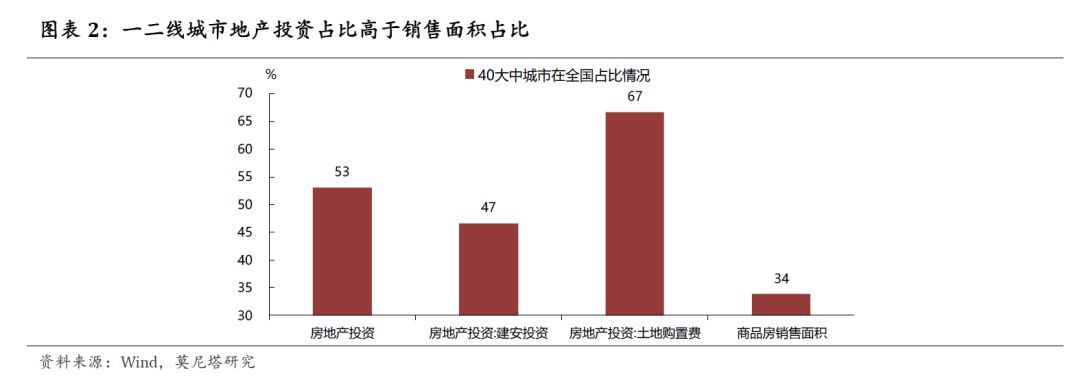 从房地产投资的角度来看,一二线城市单位销售面积对应的投资额更高。按照全国40大中城市的口径,一二线城市在全国商品房销售面积中的占比为34%左右。房地产投资主要分为两块:土地购置费与建安投资。由于一二线城市平均地价较高,其在全国土地购置费的占比达到67%,而在整体建安投资的占比达到47%(图表2)。一二线城市建安投资占比高于销售面积占比,可能与施工的成本和标准更高有关。加总来看,一二线城市占比在53%左右。由于一二线城市单位销售面积对应的(住宅)投资额更高,加之目前一二线城市的销售表现要明显好于三四线城市,一二线城市销售回暖对全国房地产投资的带动会更大。