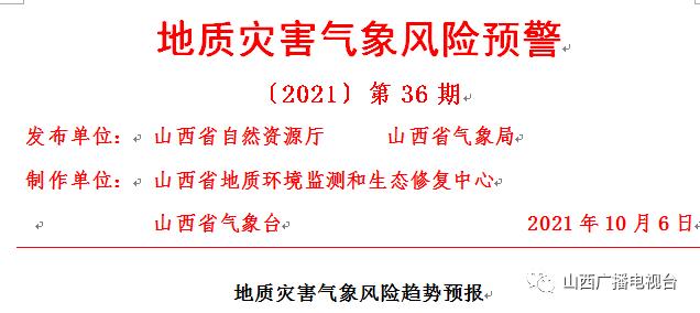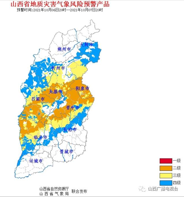 山西省自然资源厅和山西省气象局2021年10月6日17时30分联合发布地质灾害气象风险预警:受前期持续强降水影响,预计未来24小时,忻州南部、太原、吕梁中南部、阳泉、晋中北部和西部、临汾北部、长治西北部等地的部分区域地质灾害气象风险预警等级为二级橙色,有高地质灾害气象风险;忻州中东部、太原西部、吕梁北中部、晋中东山和南部、临汾中部、长治北部等地的部分区域地质灾害气象风险预警等级为三级黄色,有较高地质灾害气象风险。