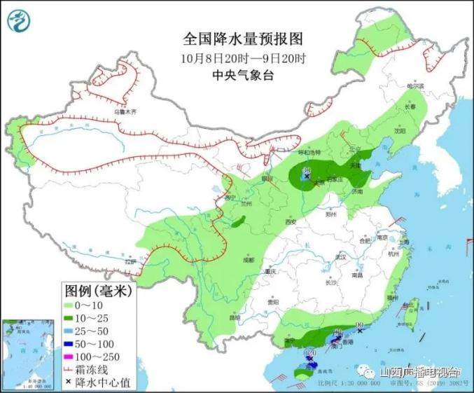 图3 全国降水量预报图(10月8日20时-9日20时)