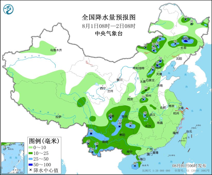 8月1日08时至2日08时,内蒙古东部、吉林西部、河北中北部、北京、天津、河南西部、西南地区东部和南部、广西西北部、海南岛等地部分地区有中到大雨,其中,内蒙古东部、吉林北部、河北北部、北京北部和西部沿山地区、四川东南部、云南西北部等地局部地区有暴雨(50~90毫米)。内蒙古中部、甘肃河西、浙江北部等地部分地区有4~6级风,其中,浙江北部部分地区有7~8级风(见图1)。
