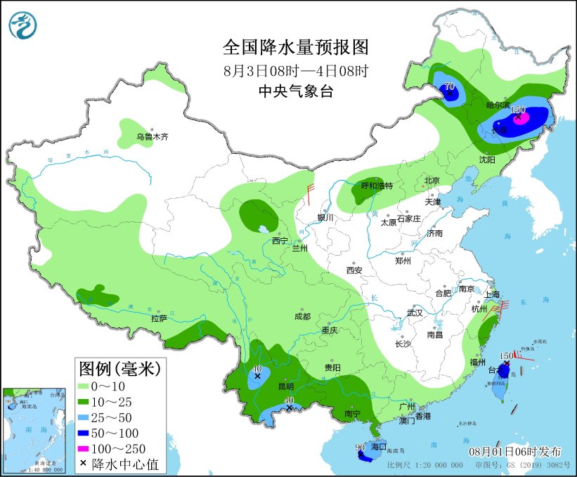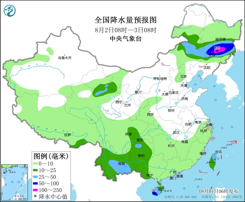 8月2日08时至3日08时,内蒙古东部、黑龙江南部、吉林大部、青海北部、四川东部、贵州、云南、广西西部、海南岛、台湾岛等地部分地区有中到大雨,其中,黑龙江东南部、吉林中东部、海南岛西南部等地局地有暴雨或大暴雨(100~150毫米)。辽宁中部、浙江北部等地部分地区有4~5级风(见图2)。