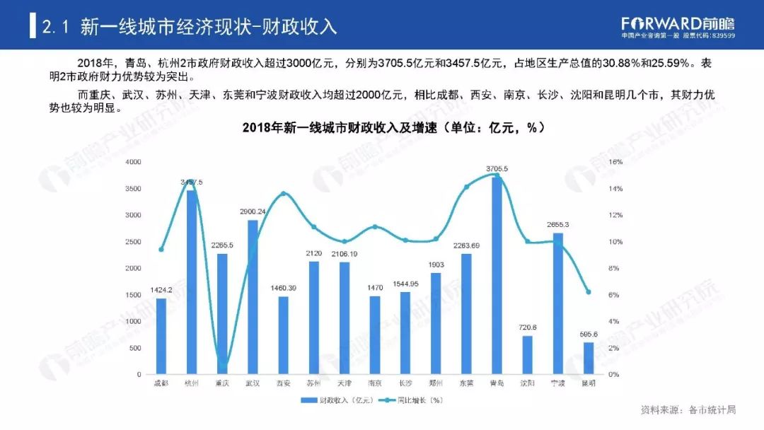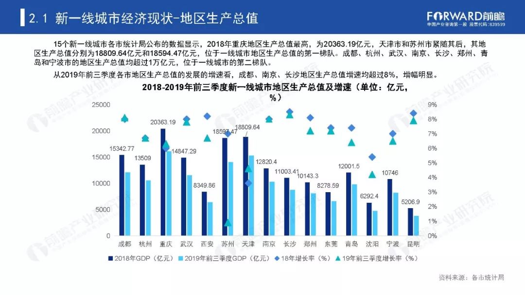 2019年15座新一线城市依次为成都、杭州、重庆、武汉、西安、苏州、天津、南京、长沙、郑州、东莞、青岛、沈阳、宁波、昆明。在新一线城市的名单中,北方城市一共有5座,南方城市的数量达到了10座。