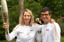 7月8日,博瓦勒野生动物园园长鲁道夫·德洛尔(右)和法国航海家莫德·丰特努瓦传递奥运圣火,身后是大熊猫双胞胎“欢黎黎”和“圆嘟嘟”。当日,巴黎2024奥运圣火来到位于法国中部城市圣艾尼昂的博瓦勒野生动物园进行传递,旅法大熊猫“圆仔”、“欢黎黎”、“圆嘟嘟”见证了这一历史时刻。