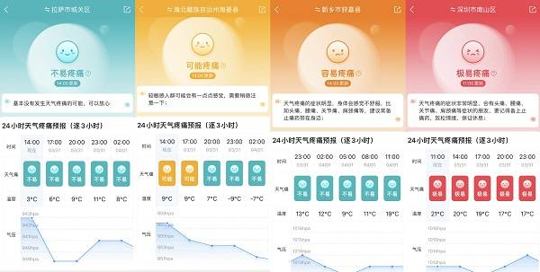 墨迹天气「天气疼痛预报」功能将风险指数划分为“不易疼痛”“可能疼痛”“容易疼痛”和“极易疼痛”4个等级,并根据不同等级给出疼痛症状提醒及注意事项,比如“极易疼痛”时,可能伴有头痛、腰痛、关节痛、肩颈痛等症状,提醒用户备好止痛药,放松心情和保证休息;“可能疼痛”时,敏感人群会伴有轻微的身体不适,需要稍微注意。天气疼痛等级还可辅助用户监测自身疼痛变化,并进行自我总结,在何时容易产生“天气疼痛”症状、找出在何时做出应对比较有效等方法经验,帮助用户做好病前预防、病中应对、病后复盘等一系列措施。