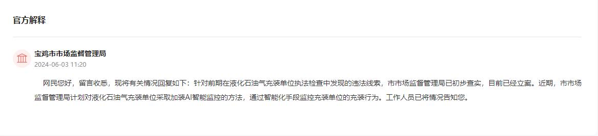6月3日,宝鸡市市场监督管理局再次回复称:“针对前期在液化石油气充装单位执法检查中发现的违法线索,(宝鸡)市市场监督管理局已初步查实,目前已经立案。近期,(宝鸡)市市场监督管理局计划对液化石油气充装单位采取加装AI智能监控的方法,通过智能化手段监控充装单位的充装行为。”