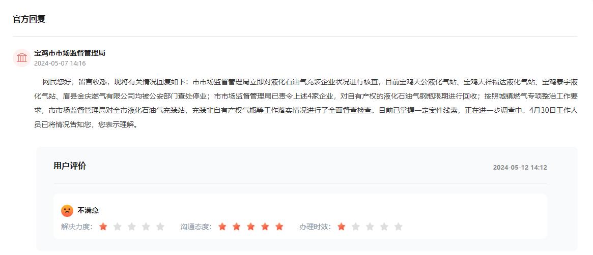 对于网民反映的问题,宝鸡有关方面先后两次作出回应。5月7日,宝鸡市市场监督管理局回复称:“目前宝鸡天公液化气站、宝鸡天祥福达液化气站、宝鸡泰宇液化气站、眉县金庆燃气有限公司均被公安部门查处停业;(宝鸡)市市场监督管理局已责令上述4家企业,对自有产权的液化石油气钢瓶限期进行回收;按照城镇燃气专项整治工作要求,(宝鸡)市市场监督管理局对全市液化石油气充装站,充装非自有产权气瓶等工作落实情况进行了全面督查检查。目前已掌握一定案件线索,正在进一步调查中。”