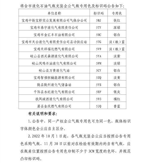 2022年,宝鸡市市场监督管理局发布了《关于全市液化石油气充装企业气瓶标识码及气瓶分色管理有关情况的公告》,当中公布了全市液化石油气瓶充装企业气瓶专用色及标识码,其中,天公液化气有限责任公司县功供应站专用色为淡(酞)蓝,天祥福达燃气有限公司专用色为淡(酞)蓝,泰宇液化气有限责任公司专用色为深绿,眉县金庆燃气有限公司专用色为普蓝。