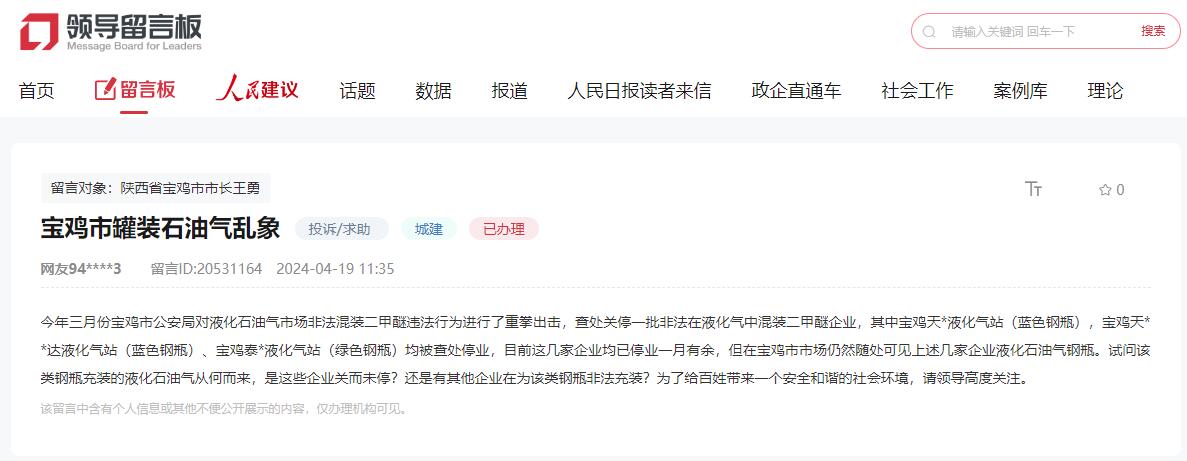 “试问该类钢瓶充装的液化石油气从何而来?是这些企业关而未停?还是有其他企业在为该类钢瓶非法充装?”2024年4月19日,有网民通过人民网“领导留言板”反映,今年3月,宝鸡市公安局查处关停了一批在液化气中非法混装二甲醚的企业,然而,已被查处停业企业的自有产权液化石油气钢瓶一个月后在宝鸡市市场上仍然随处可见。