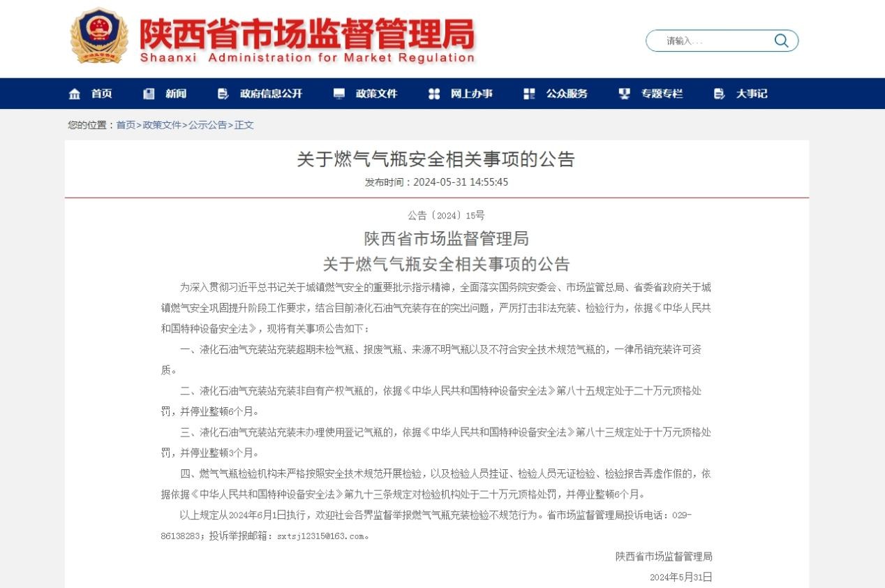 5月31日,陕西省市场监督管理局发布《关于燃气气瓶安全相关事项的公告》,当中提到: