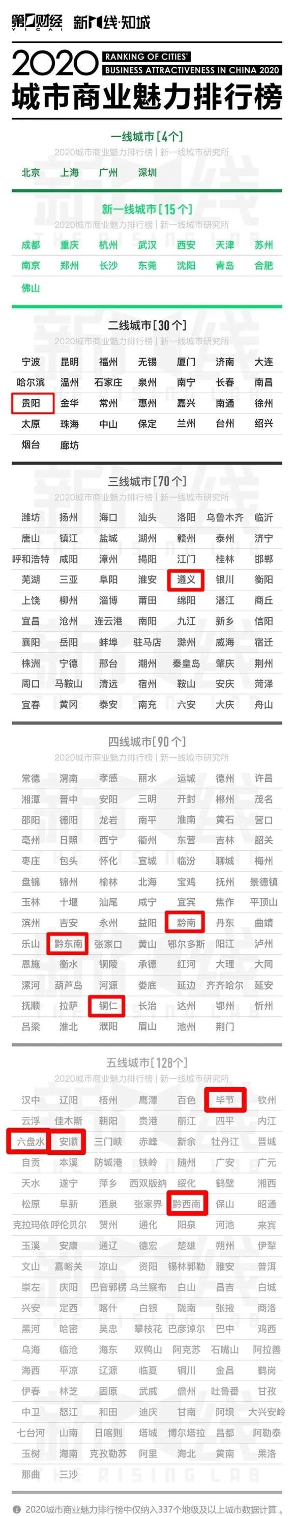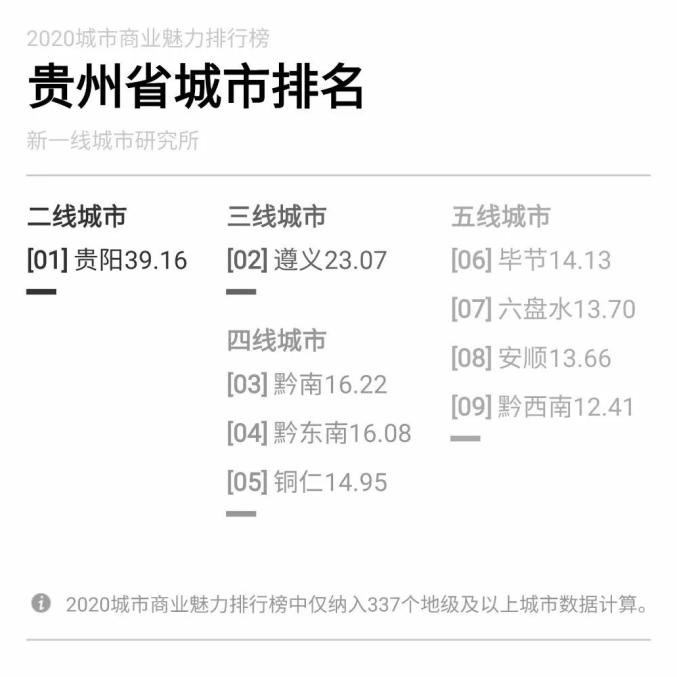 值得提到的是,在此次排名中,贵阳成为二线城市,遵义则为三线城市,其余7个市州中,黔南州、黔东南州、铜仁市为四线城市,其余为五线城市。