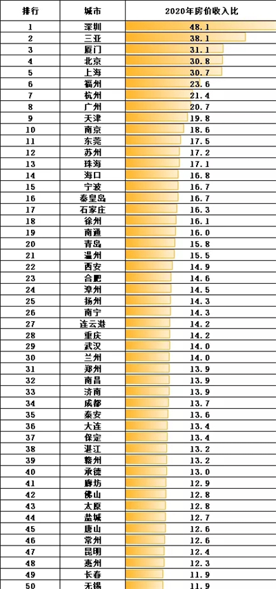2020年百城房价收入比排行榜TOP50城市 图源:诸葛找房数据研究中心