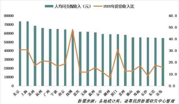 2020年城镇居民人均可支配收入TOP20城市房价收入比情况 图源:诸葛找房数据研究中心
