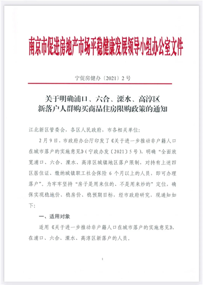 4月19日,南京市发布《关于明确浦口、六合、溧水、高淳区新落户人群购买商品住房限购政策的通知》,表明要牢牢坚持“房子是用来住的、不是用来炒的”定位,确保实现稳地价、稳房价、稳预期目标。