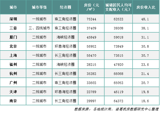 全国房价收入比最高的城市为深圳,达到48.1,连续多年位居全国榜首。北京和上海房价收入比也分别达到30.8和30.7。而作为新一线城市的南京,房价收入比为18.6,位居全国第十名,这代表南京人要想供一套达到城市人均住房面积的房子,得“勒紧裤腰带”至少掏出十八年的工资。